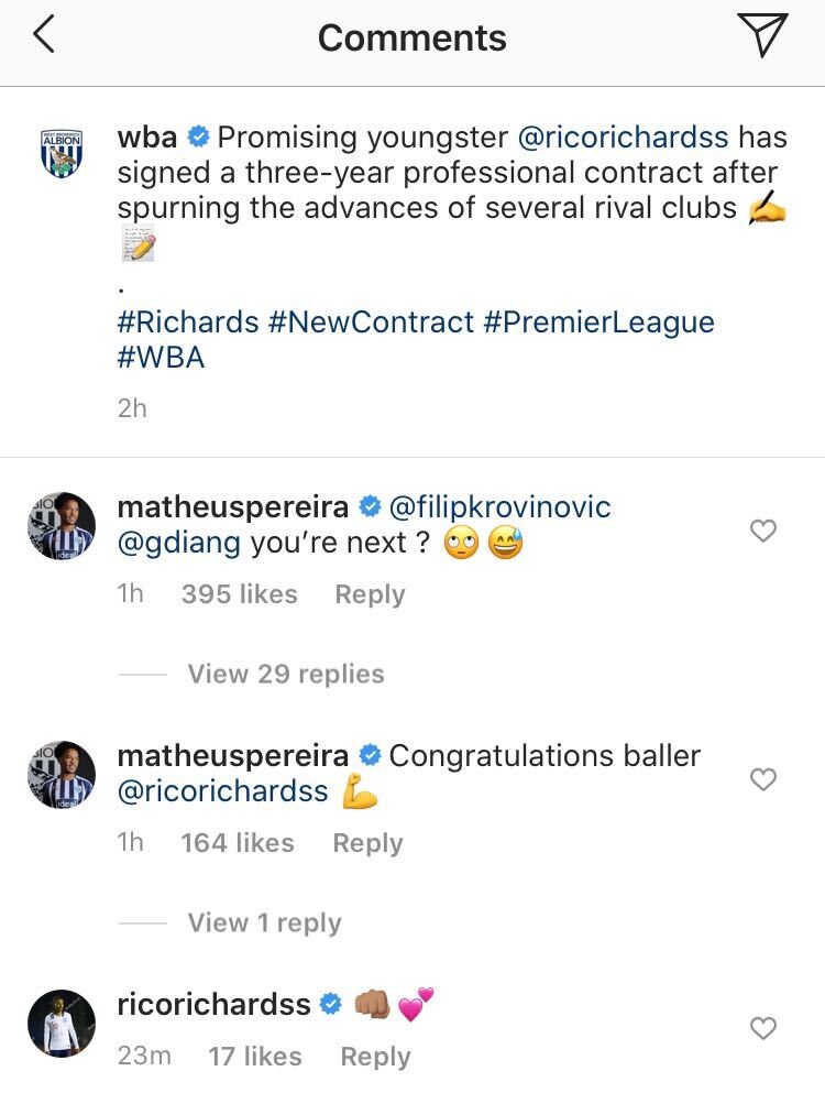 The Baggies announced on Instagram on Tuesday that promising young forward Rico Richards has signed a new deal with the club and as Pereira congratulated the 16-year-old, he also had a short message for Diangana and Krovinovic.