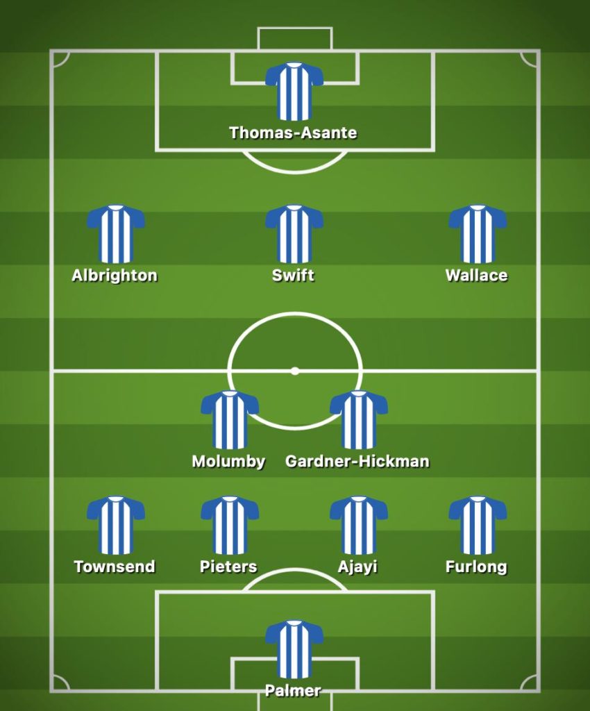 Brandon Thomas-Asante is therefore expected to lead the line, while Jed Wallace should be fielded on the right wing and John Swift in a central attacking position.