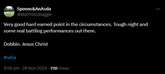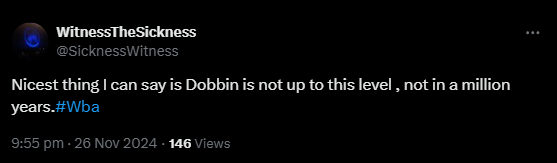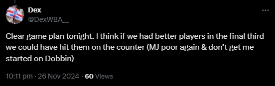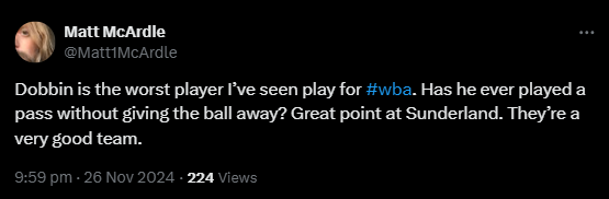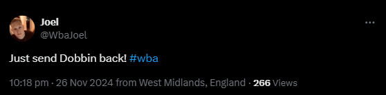 Supporters are clearly fed up with the lack of impact Dobbin has when coming on as a substitute and it could be that the Baggies end his loan deal early and send him back to Aston Villa.