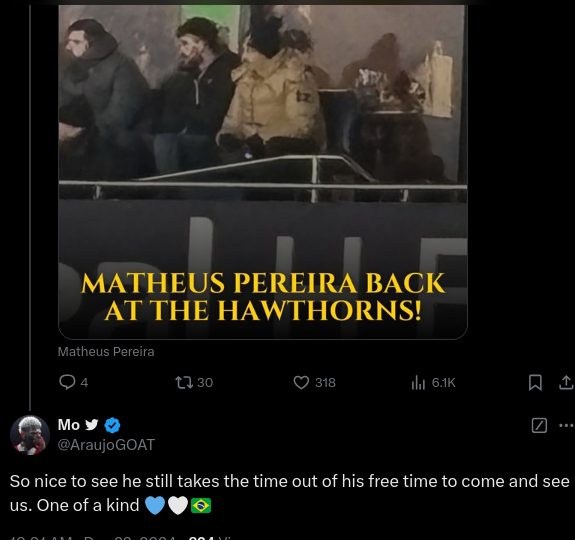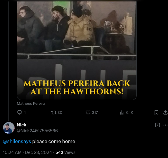 Among the supporters at The Hawthorns for the final home game of 2024 was former player Pereira, who was pictured in the stands [@talkwba via X, 23 December].